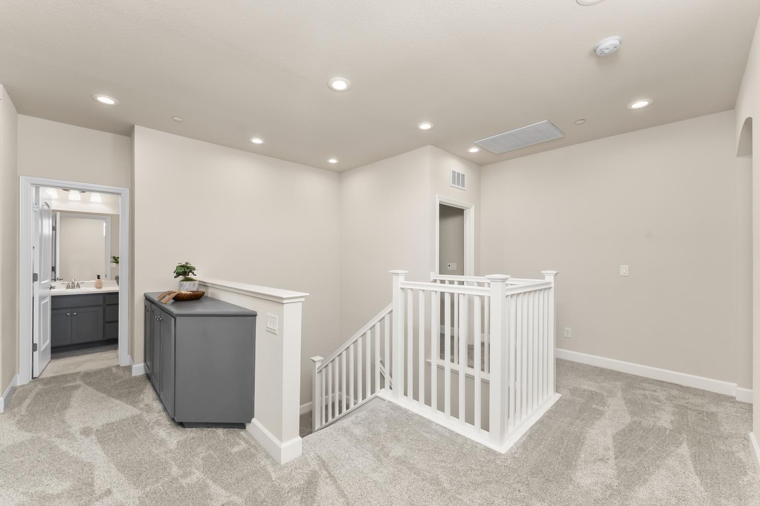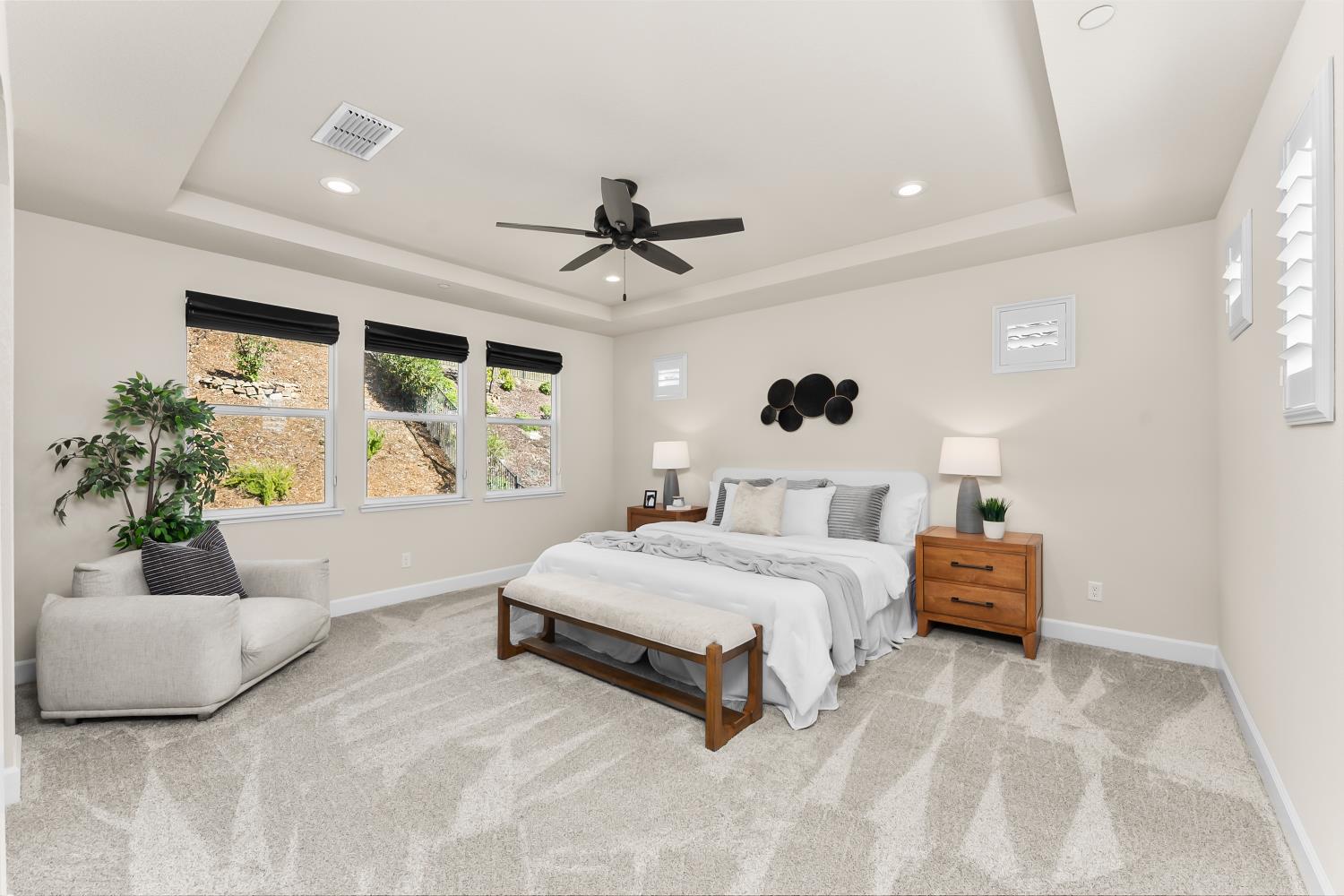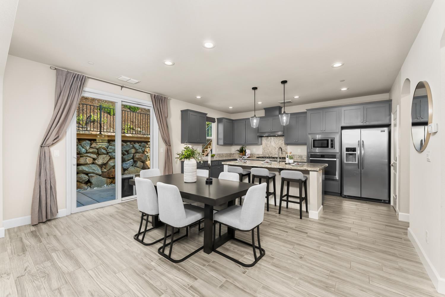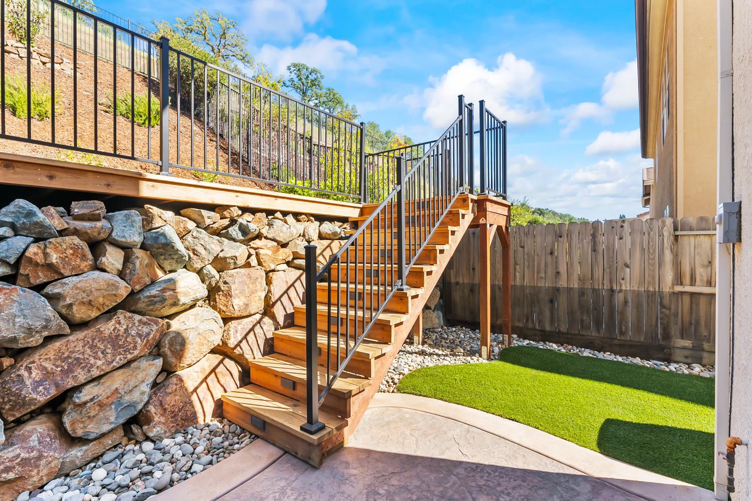 Located in El Dorado Hills within a private gated community home, this thoughtfully designed home offers the perfect blend of comfort, style, and conveniencejust minutes from Town Center and Folsom. The main level features a bright, open-concept layout that seamlessly connects the kitchen, dining, and living spacesideal for both everyday living and entertaining. A formal dining room adds an elegant touch and includes a convenient pass-through bar to the kitchen, enhancing flow for hosting. A bedroom on the main level provides flexibility for guests, a home office, or multigenerational living. Upstairs, you'll find fresh carpet throughout, along with two guest bedrooms and a spacious primary suite. The primary retreat offers generous proportions and a well-appointed en-suite bathroom featuring dual vanities, a centrally positioned soaking tub, and a large walk-in closet. Plantation shutters throughout all bedrooms add both style and privacy. Outside, a stamped concrete patio wraps around the home with convenient side yard access. An additional area of artificial turf maximizes usable space, while the thoughtfully terraced backyard is designed for both functionality and enjoyment. Multiple outdoor living areas culminate in a beautiful upper deck perfect for relaxing and entertaining. Additional highlights include owned solar, ample storage, and extra space for parking. This home offers an exceptional lifestyle opportunity in a prime El Dorado Hills location.